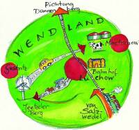 Die Exposé-Tour: Familie Zausel kommt mit dem Zug in Lüchow an, fährt mit Pferdekraft weiter zu „Wendolina", den Windkraftanlagen auf dem Jeetzeler Berg und von dort mit dem pflanzenölbetriebenen 3-Liter-Lupo zur Biogasanlage nach Meetschow... |
